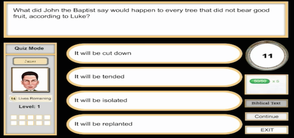 learn moreChoose to climb the game’s 20 levels in the Ultimate Bible Quiz Challenge. This game is no picnic and the questions get harder the higher you climb. To win, you must get from level 1 to level 20 without making too many mistakes.